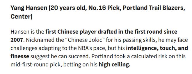 瀚森是2007年以來首位在首輪被選中的中國(guó)球員。因出色的傳球能力,他被冠以“中國(guó)約基奇”的稱號(hào)。盡管可能面臨適應(yīng)NBA節(jié)奏的挑戰(zhàn),但他的球商、手感與技巧都預(yù)示著他有能力在聯(lián)盟立足。開拓者隊(duì)在首輪中段選中他,是一次經(jīng)過深思熟慮的冒險(xiǎn),賭的正是他的高上限。